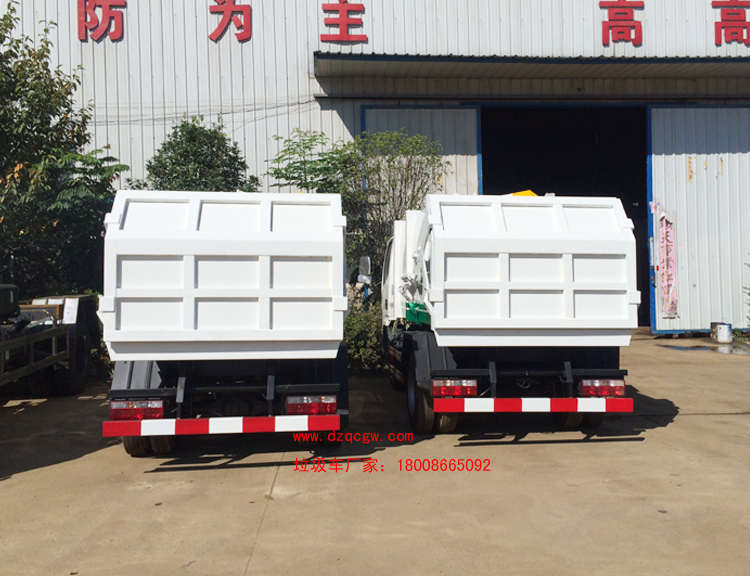 卸料結(jié)構(gòu):系用箱卸料,由兩只液壓油缸直接舉升車廂進行卸料,箱底與地面夾角不小于45度,以實現(xiàn)垃圾依靠自重能自行卸下的專用自卸運輸車。