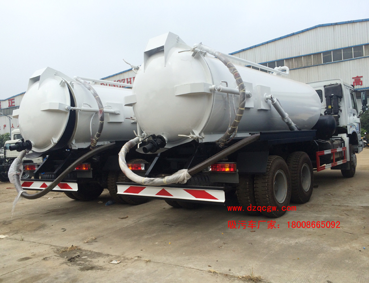 由中國重汽集團湖北華威專用汽車有限公司在我廠下的兩臺6X6重汽豪沃吸污車已生產完畢,該車出口到非洲,采用重汽HOWO原裝6X6底盤,上裝為我廠改裝18方吸污罐體,所圖所示!