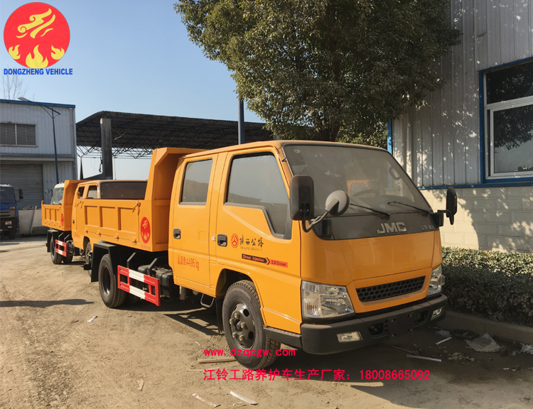 我公司生產(chǎn)的江鈴公路養(yǎng)護車是一款雙排座自卸車,該車實用性強,性價比高,是一款適用于公路養(yǎng)護作業(yè)的理想用車型。主要配置為江鈴雙排駕駛室,3360mm軸距,江鈴115馬力國五發(fā)動機,7.00R16LT鋼絲胎,油剎,5檔箱,排氣制動,原廠ABS。上裝部分主要由液壓系統(tǒng)、操作系統(tǒng)組成。舉升油缸為雙頂油缸,箱體標配邊3底4mm。