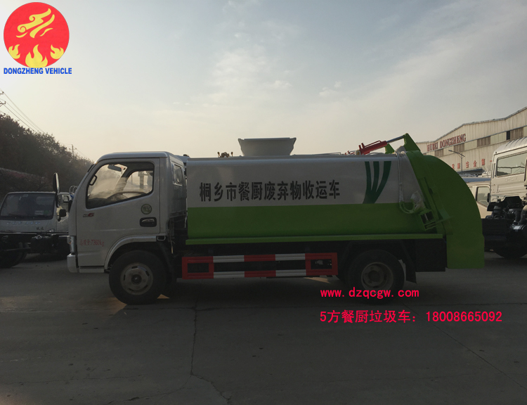 浙江省嘉興市桐鄉市政在我公司訂購6臺餐廚垃圾車,該餐廚垃圾車采用東風小多利卡國五底盤,朝柴102馬力,3308mm軸距,鋼絲胎,ABS。圓形碳鋼罐體,罐體厚度5mm,拉桿提升機帶上蓋聯動;后蓋液壓開啟;內置推鏟卸料,帶渣液分離功能。餐廚垃圾車可分罐式和廂式。