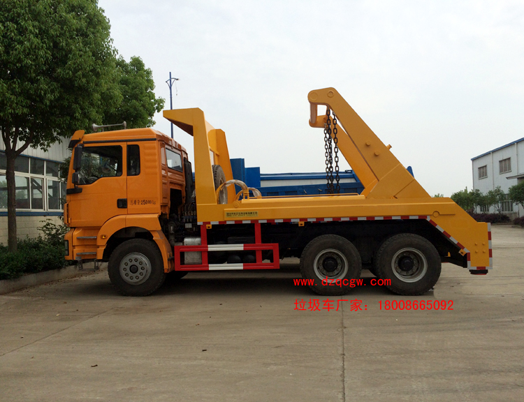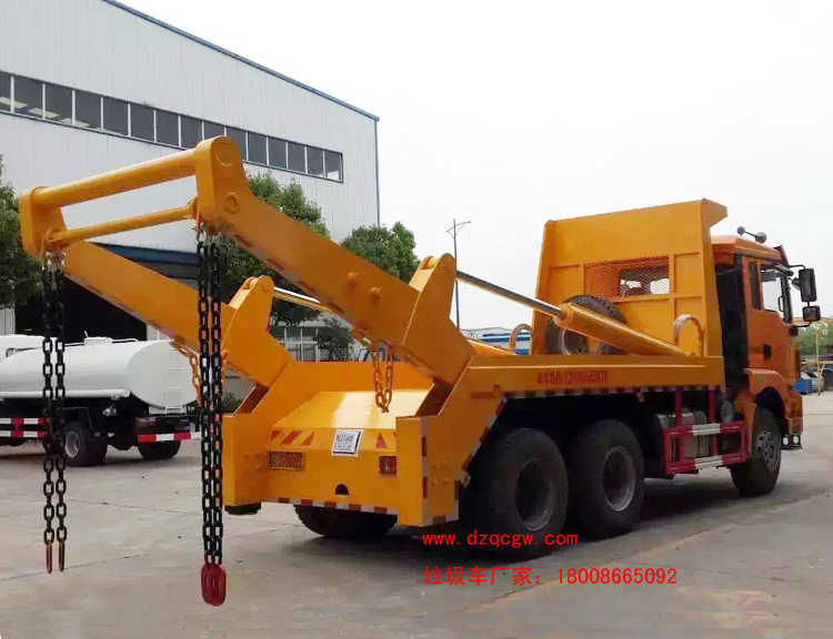 上裝說明: 產品介紹:擺臂式垃圾車加裝統一配套液壓舉升總成,通過左右兩臂裝運全國統一擺臂式垃圾斗,可一車配多廂,帶自卸功能,可自行傾倒垃圾。 可加裝密封蓋,防止泄露飛揚污染,在裝卸的運輸過程中可有效地避免二次污染,以適應不同環境使用要求,該車結構簡單,操作穩定方便,裝卸效率高,機械化程度高,節省人力,采用國內領先技術及軍工企業配件,質量可靠,安全穩定,可由生產廠家為用戶提供垃圾廂圖紙,協助用戶設計垃圾廂。