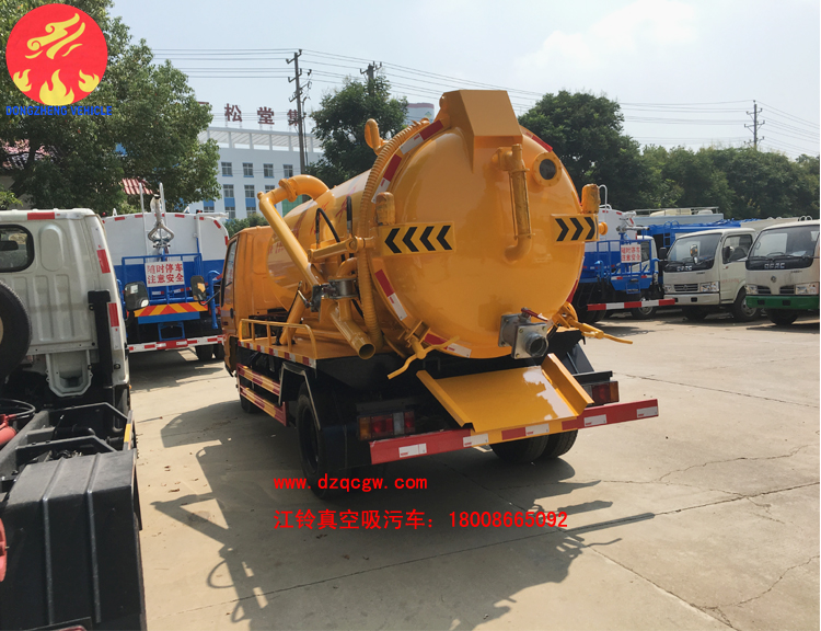 改裝部分:標配國產多路閥、油缸;隨州真空泵,油水分離器,四通閥,洗手裝置。罐體后封頭球閥控制自流口1個,1個視污窗,1根7m吸糞管,舉升式罐體,罐體兩側油缸,后蓋液壓開啟,機械鎖緊,帶液位報警;普通油漆。