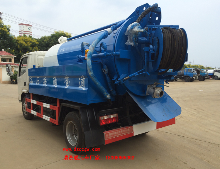 吸污部分主要配備:國產多路閥、油缸;國產高質量真空泵,油水分離器,四通閥,洗手裝置。罐體后封頭球閥控制自流口1個,1個視污窗,1根7米吸糞管,普通油漆。一次性成型舉升式罐體,罐體兩則油缸,后蓋液壓開啟,機械鎖緊,帶液位報警。主要用于下水道、雨水井、檢查井、化糞池及各種溝渠內的污泥、糞便或石油化工廠污水池淤積物的抽吸、裝運和排卸。